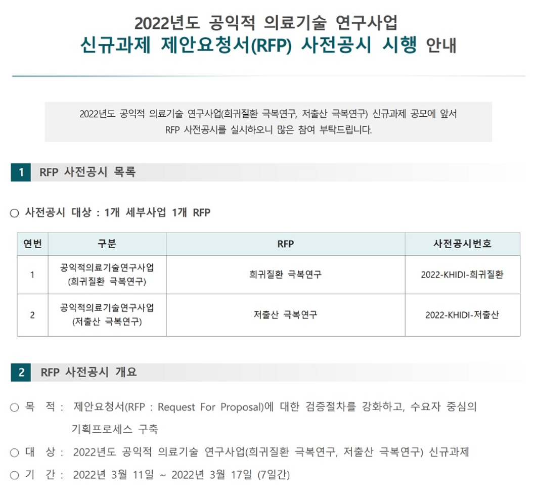 공익적 의료기술(희귀질환 저출산) 신규과제 제안요청서(RFP) 사전공시 시행 안내
