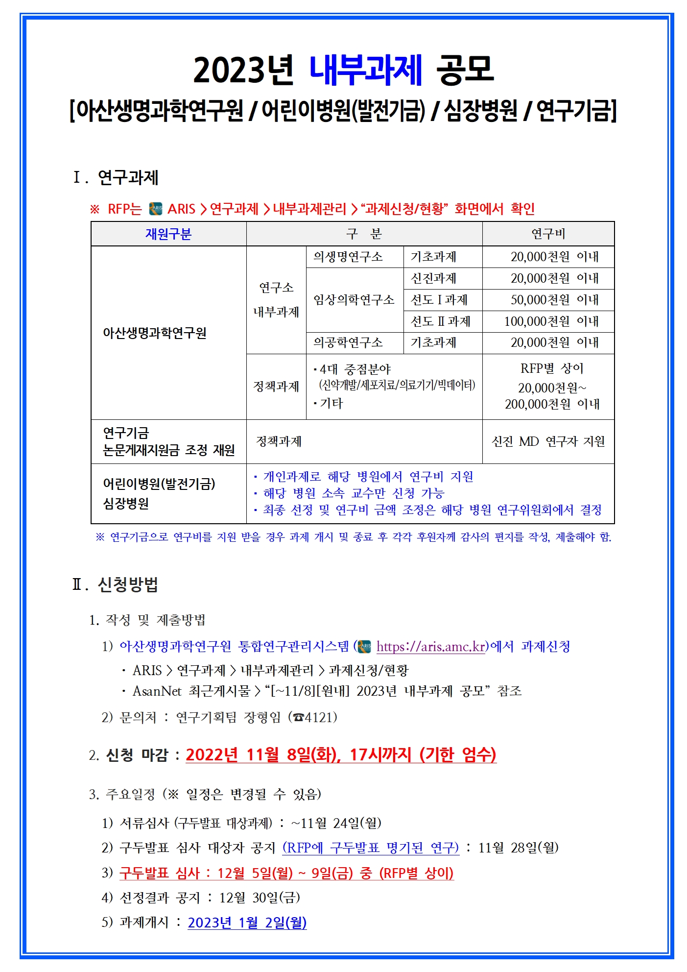 [원내] 2023년 내부과제 공모 (연구원/어린이병원/심장병원/연구기금)
