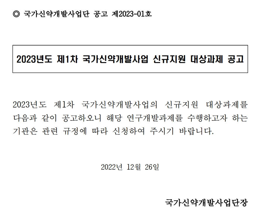 2023년도 제1차 국가신약개발사업 신규지원 대상과제 통합공고