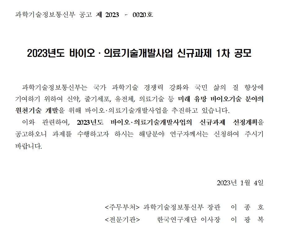 [붙임1] 2023년 바이오의료기술개발사업 신규과제 제1차 공고문 (제2023-0020호).hwp