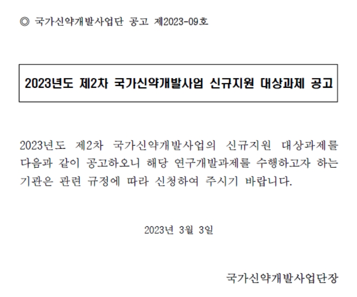 제2차 국가신약개발사업 신규지원 대상과제 공고