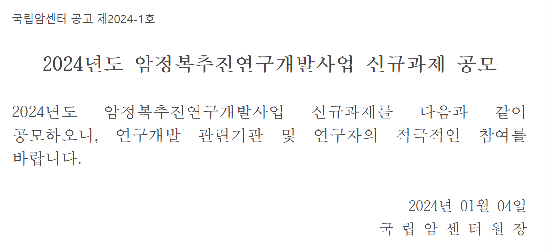 2024년도 암정복추진연구개발사업 신규과제 공모