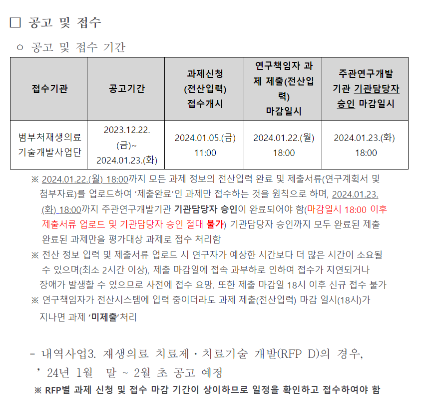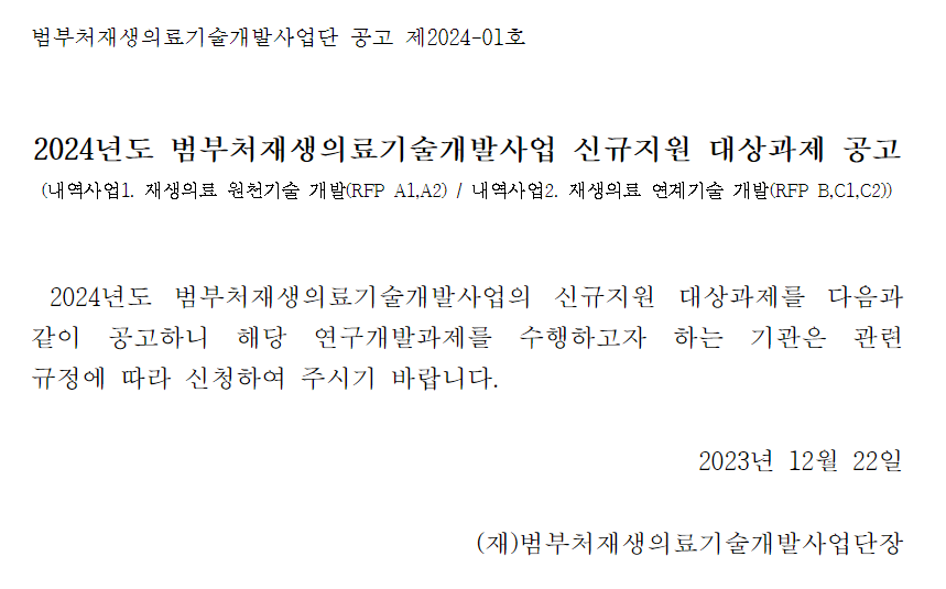 2024년도 범부처재생의료기술개발사업 신규지원 대상과제 공고