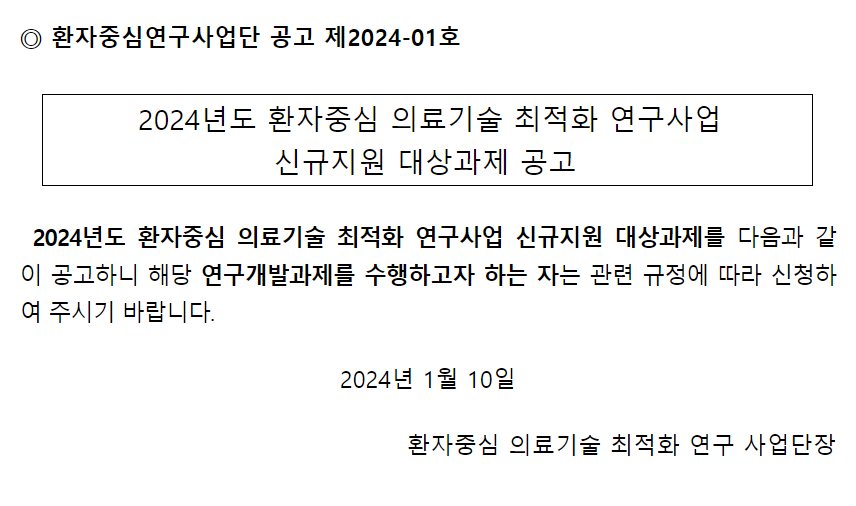 2024년도 환자중심 의료기술 최적화 연구사업 신규지원 대상과제 공고