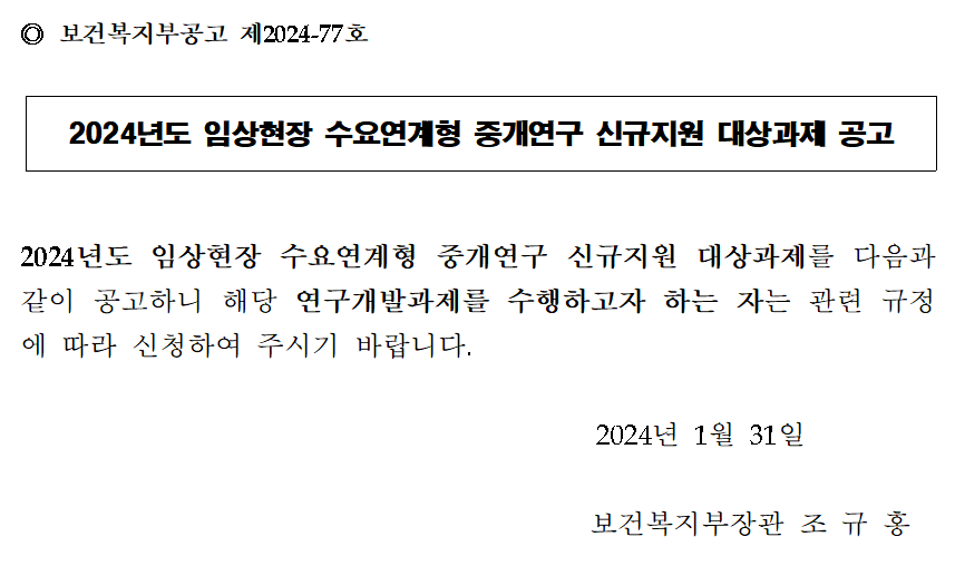2024년도 임상현장 수요연계형 중개연구 신규지원 대상과제 공고