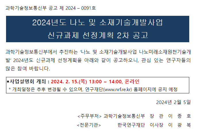2024년도 나노 및 소재기술개발사업 신규과제 선정계획 2차 공고