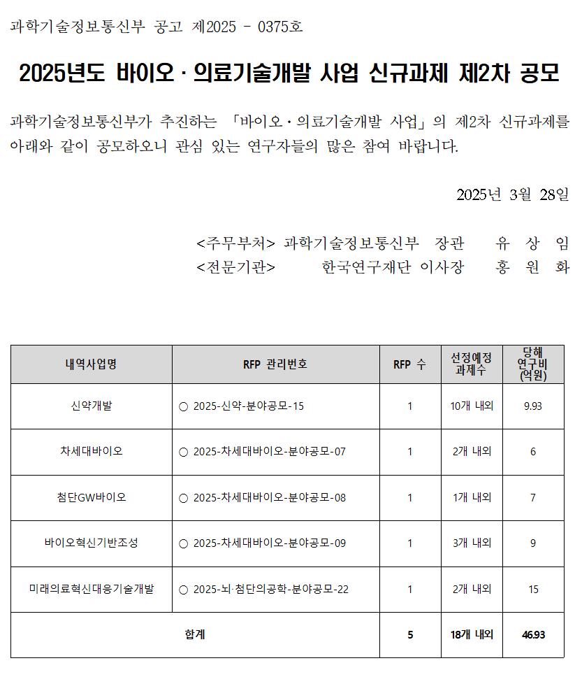2025년 바이오의료기술개발 사업 신규과제 제2차 공고문.hwp