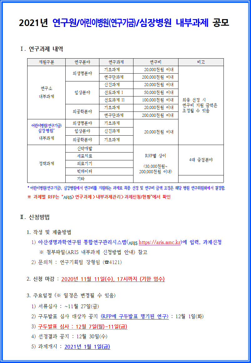 [내부] 2021년 연구원/어린이병원(연구기금)/심장병원 내부과제 공모