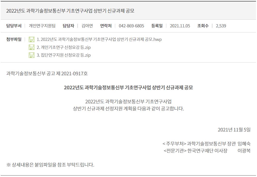 1. 2022년도 과학기술정보통신부 기초연구사업 상반기 신규과제 공모.hwp