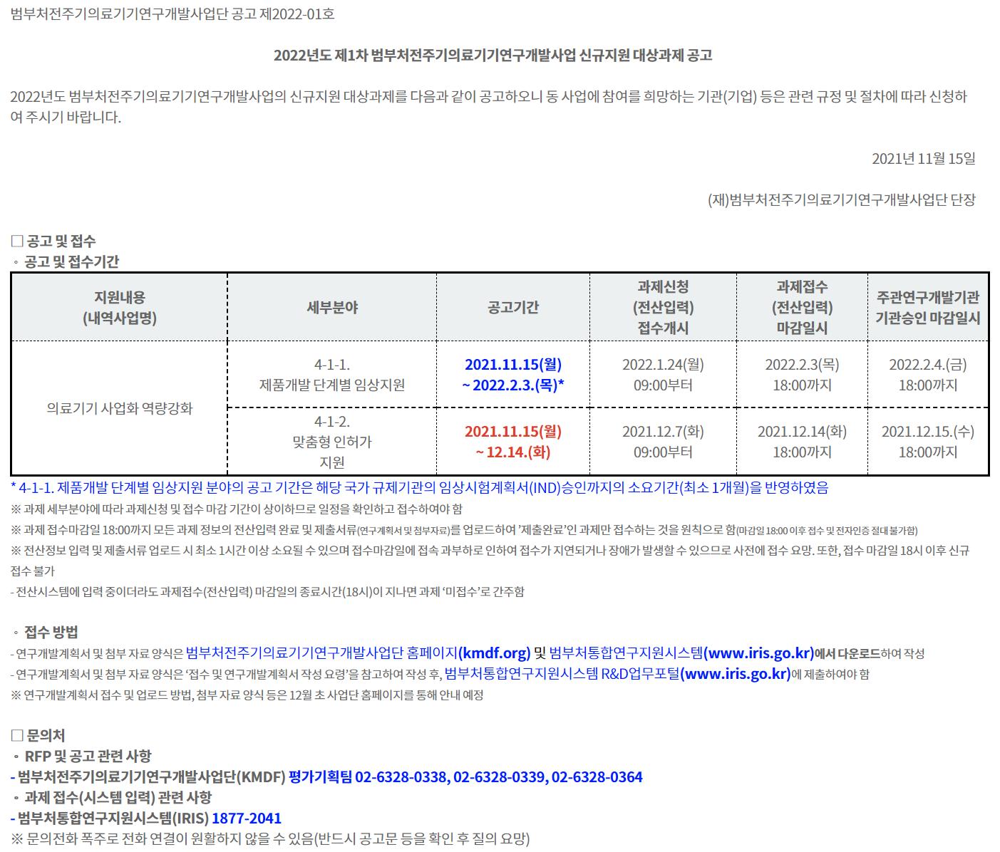 2022년도 제1차 범부처전주기의료기기연구개발사업 신규지원 대상과제 공고