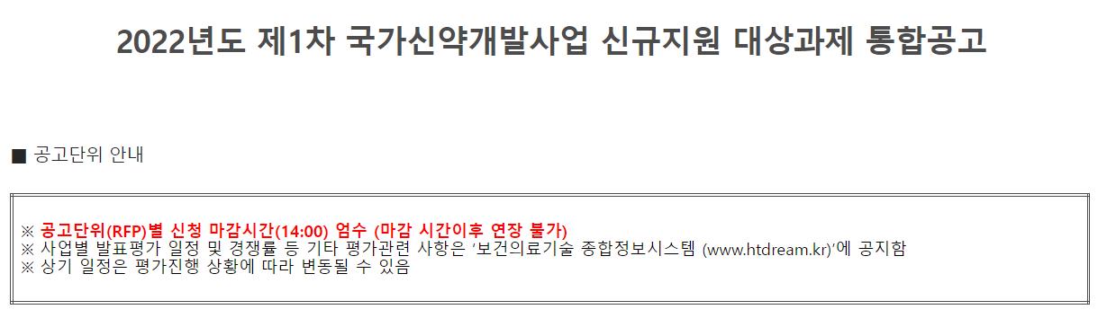 2022년도 제1차 국가신약개발사업 신규지원 대상과제 통합공고