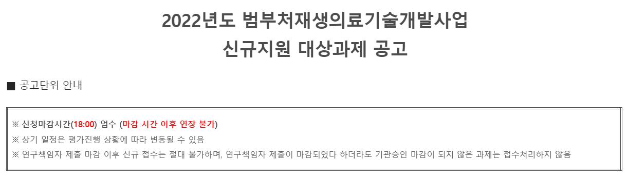 2022년도 범부처재생의료기술개발사업 신규지원 대상과제 공고